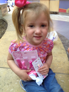 She chose the thing she wanted most (a Hello Kitty set with lip gloss and nail polish. After that, I helped her select 2 items off the $1 clearance rack to finish up her spending allotment. I will give her credit in the fact that she can make choices MUCH faster than Sadie!